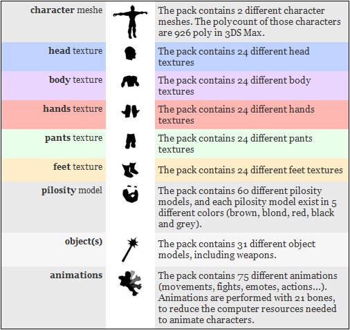 - A UNITY PACKAGE with demo scene and character scripts - muscular human - fat human - fat and muscular Ragdolls for Unity - 5 commoners for RTSStarterKit - 2 archers for RTSStarterKit - 3 warriors for RTSStarterKit - commoner#1 : feet, 3 x hands, pants, body - commoner#2 : feet, hands, pants, body - peasant : feet, 3 x hands, pants, 3 x body - landlord : feet, pants, body - blacksmith : feet, hands, pants, 3 x body - townsman#1 : feet, hands, pants, body - townsman#2 : feet, hands, pants, body - noble : feet, hands, pants, body - robin hood : feet, hands, pants, body - pirate#1 : feet, hands, pants, body - pirate#2 : feet, 3 x hands, pants, 3 x body - leather#1 : feet, hands, pants, body - leather, fur : feet, hands, pants, body - leather, tabard : feet, hands, pants, body - leather, studded : feet, hands, pants, body - leather#2 : feet, hands, pants, body - leather#3 : feet, hands, pants, body - chainmail & leather : feet, hands, pants, body - chainmail#1 : feet, hands, pants, body - chainmail#2 : feet, hands, pants, body - heavy : feet, hands, pants, body - heavy, dirty : feet, hands, pants, body - heavy, tabard : feet, hands, pants, body ![]() - head 1 - head 2 (smiling) - head 3 (arrogant) - head 4 (young) - head 5 (old) - head 6 - head 7 (sick) - head 8 (undead) - pilosity 1 : eyebrows#1 without hair - pilosity 2 : eyebrows#1 + short hair - pilosity 3 : eyebrows#1 + short hair with baldness - pilosity 4 : eyebrows#1 + hair - pilosity 5 : eyebrows#1 + hair with baldness - pilosity 6 : eyebrows#2 without hair - pilosity 7 : eyebrows#2 + short hair - pilosity 8 : eyebrows#2 + short hair with baldness - pilosity 9 : eyebrows#2 + hair - pilosity 10 : eyebrows#2 + hair with baldness - pilosity 11 : moustache#1 without hair - pilosity 12 : moustache#1 + short hair - pilosity 13 : moustache#1 + short hair with baldness - pilosity 14 : moustache#1 + hair - pilosity 15 : moustache#1 + hair with baldness - pilosity 13 : moustache#2 without hair - pilosity 17 : moustache#2 + short hair - pilosity 18 : moustache#2 + short hair with baldness - pilosity 19 : moustache#2 + hair - pilosity 20 : moustache#2 + hair with baldness - pilosity 21 : big moustache#1 without hair - pilosity 22 : big moustache#1 + short hair - pilosity 23 : big moustache#1 + short hair with baldness - pilosity 24 : big moustache#1 + hair - pilosity 25 : big moustache#1 + hair with baldness - pilosity 26 : big moustache#2 without hair - pilosity 27 : big moustache#2 + short hair - pilosity 28 : big moustache#2 + short hair with baldness - pilosity 29 : big moustache#2 + hair - pilosity 30 : big moustache#2 + hair with baldness - pilosity 31 : big moustache#3 without hair - pilosity 32 : big moustache#3 + short hair - pilosity 33 : big moustache#3 + short hair with baldness - pilosity 34 : big moustache#3 + hair - pilosity 35 : big moustache#3 + hair with baldness - pilosity 36 : big beard#1 without hair - pilosity 37 : big beard#1 + short hair - pilosity 38 : big beard#1 + short hair with baldness - pilosity 39 : big beard#1 + hair - pilosity 40 : big beard#1 + hair with baldness - pilosity 41 : beard#1 without hair - pilosity 42 : beard#1 + short hair - pilosity 43 : beard#1 + short hair with baldness - pilosity 44 : beard#1 + hair - pilosity 45 : beard#1 + hair with baldness - pilosity 46 : small beard#1 without hair - pilosity 47 : small beard#1 + short hair - pilosity 48 : small beard#1 + short hair with baldness - pilosity 49 : small beard#1 + hair - pilosity 50 : small beard#1 + hair with baldness - pilosity 51 : beard#2 without hair - pilosity 52 : beard#2 + short hair - pilosity 53 : beard#2 + short hair with baldness - pilosity 54 : beard#2 + hair - pilosity 55 : beard#2 + hair with baldness - pilosity 56 : small beard#2 without hair - pilosity 57 : small beard#2 + short hair - pilosity 58 : small beard#2 + short hair with baldness - pilosity 59 : small beard#2 + hair - pilosity 60 : small beard#2 + hair with baldness 31 OBJECTS- axe#1 : tool - axe#2 : 1 handed - axe#3 : 2 handed - bag#1 - bag#2 - bow - crossbow - fork - hammer - hat#1 - hat#2 - helmet#1 - helmet#2 - morningstar - pick (tool) - pirate hat#1 - pirate hat#2 - plate + tankards - potion - quiver - shield#1 - shield#2 - shoulder pads#1 - shoulder pads#2 - sword#1 : 1 handed - sword#2 : blacksmith's work - sword#3 : 1 handed - sword#4 : 2 handed - tankard - torch - wood pile - run - fall - swim - back - jump - side - turn - action1 : siting down - action2 : sat, conversation - action3 : sat, drink - action4 : geting up - action5 : unlocking door - action6 : unlocking chest - action7 : sat, discussion - action8 : pick up - action9 : drink potion - action10 : waiting, scrape the thigh - idle1 : normal - idle2 : blown - idle3 : with one's arms folded - idle4 : sleeping - idle5 : sat - idle6 : sat with tankard - idle7 : innkeeper with plate - idle8 : merchant waiting - idle9 : beggar - idle10 : peasant at work - idle11 : blacksmith at work - idle12 : look around - idle13 : mining - idle14 : waiting, carrying a bag - idle15 : waiting, carrying a wood pile - idle16 : waiting, carrying a torch - idle17 : wood chopping - walk1 : normal walking - walk2 : furtive walking - walk3 : plate - walk4 : object on shoulder - walk5 : walking and carrying a bag - walk6 : walking and carrying a wood pile - walk7 : walking and carrying a torch - emote1 : Yes - emote2 : No - emote3 : discussing - emote4 : laughing - emote6 : noble salute - emote7 : salute - emote8 : protesting - emote9 : applaud - emote10 : crying - emote11 : frightened - emote12 : discussing - bow_idle : bow, wait - bow_attack : bow, fire - bow_hit : bow, hit - crossbow_fire : attack - using a crossbow - crossbow_hit : hit - carrying a crossbow - crossbow_idle : idle - carrying a crossbow - crossbow_run : run - carrying a crossbow - H2H_hit : hit - hand to hand fight - H2H_idle : idle - hand to hand fight - H2H_punch : punch - hand to hand fight - 1h_run : 1 handed weapon, charge - 1h_idle : 1 handed weapon, wa